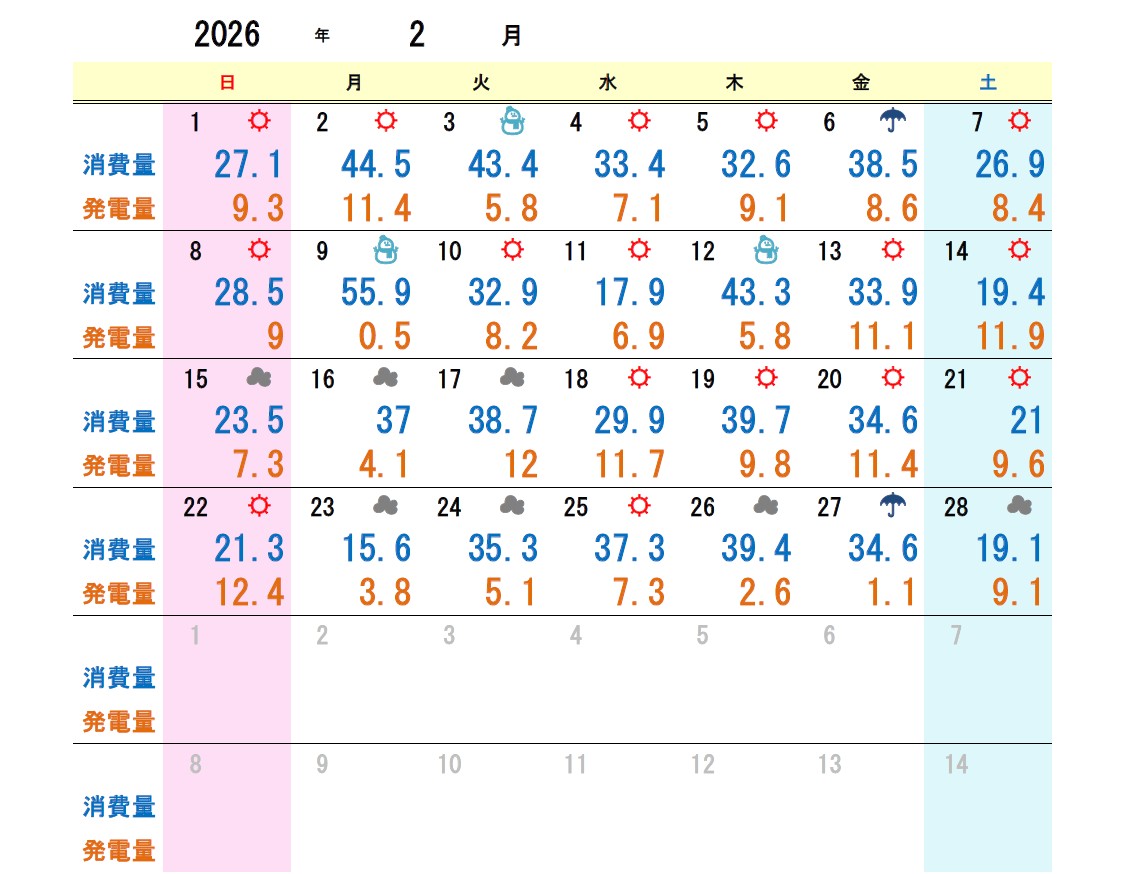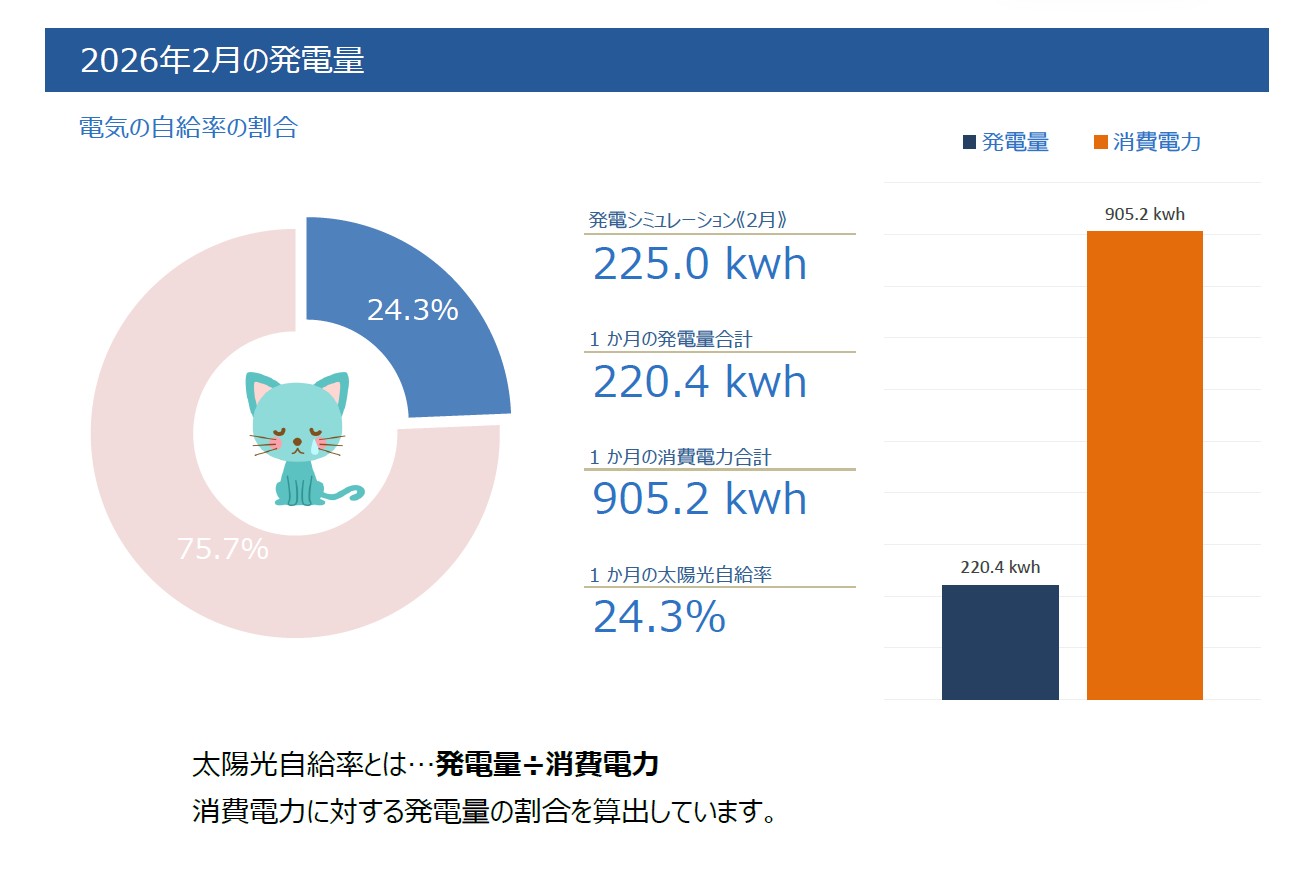 2月は発電シュミレーションには若干及びませんでしたが、2月の中では頑張りました!ただ、消費電力が多く自給率は2割強の結果に(T_T)。。。