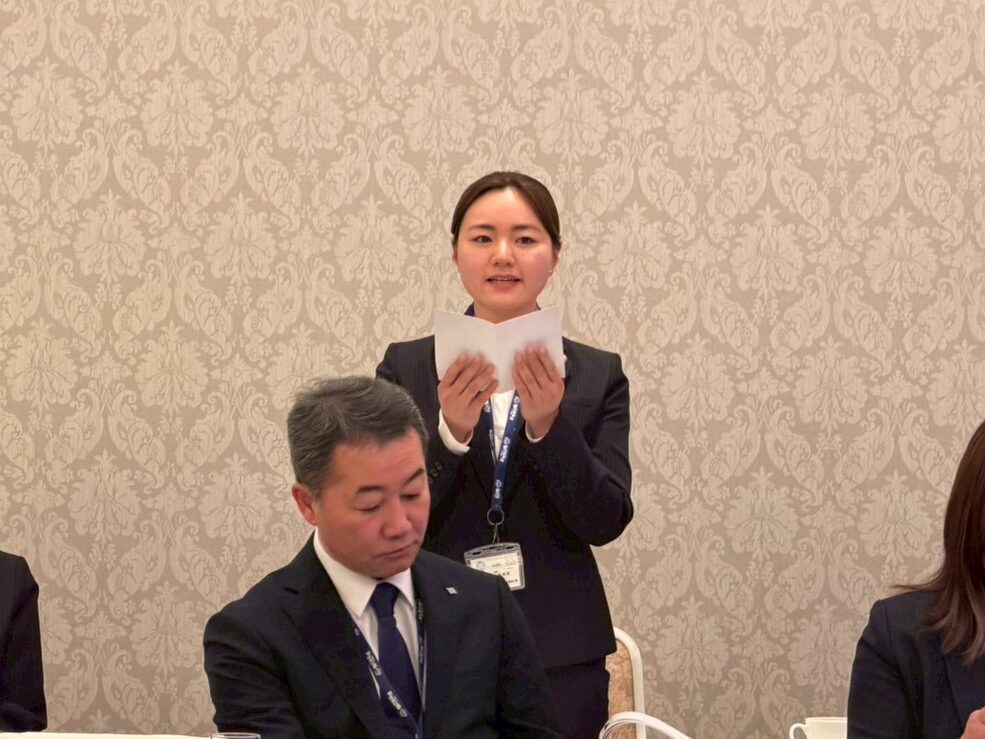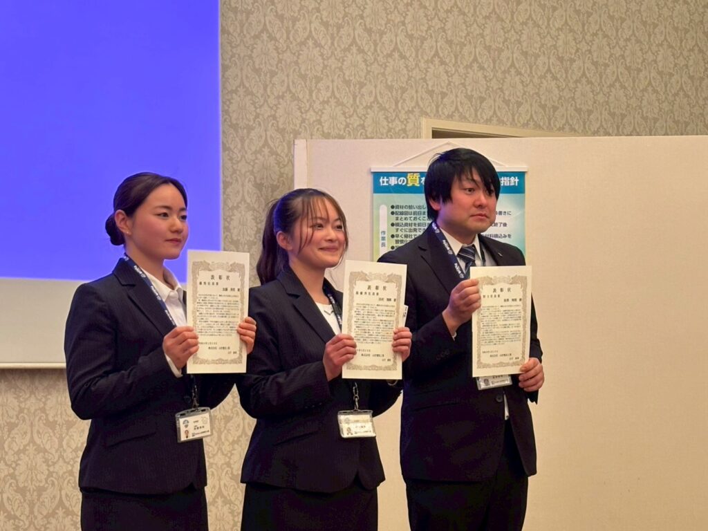 昨年度の最優秀社員賞の女性工務が決意表明を行いました。2026年度から作業長になり、今後の活躍も期待しています。