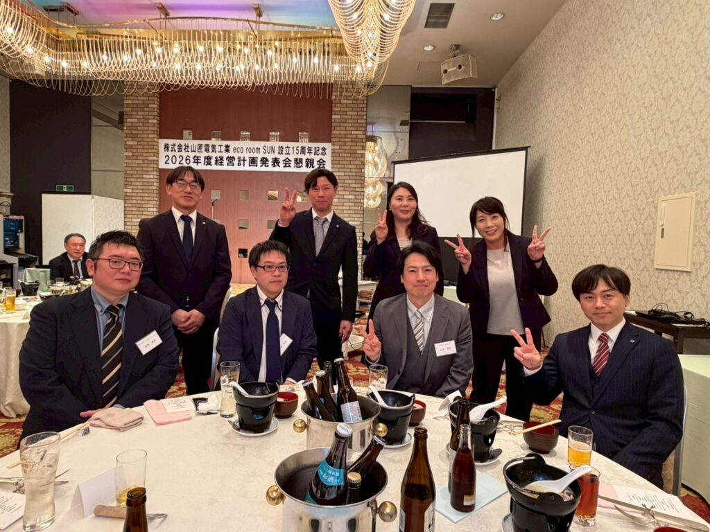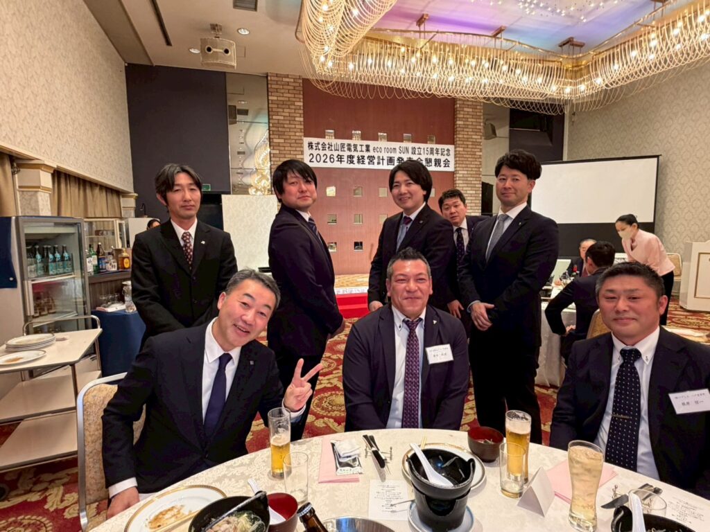 懇親会の様子です。eco room SUN設立15周年を記念して、軌跡をたどるスライドショーを上映しました。社員はもちろんですが、関わってくださっている来賓の方々も、思い出話に花が咲きました。